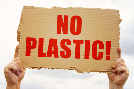 ecological concept. In the hands of a man is a cardboard sign with the inscription - NO PLASTIC