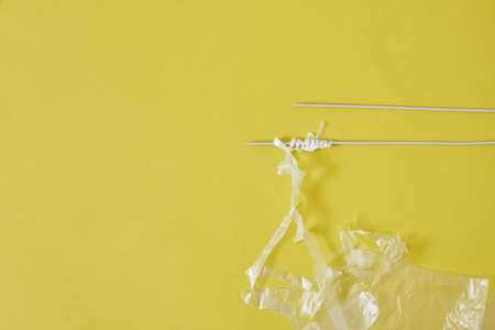 Recycled plastic yarn concept, knitting knitting needles and sliced polyethylene package on a green background, a creative concept of environmental protection against pollution by plastic
