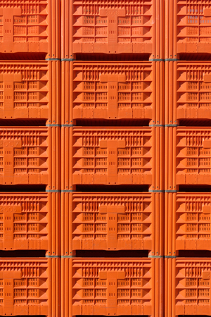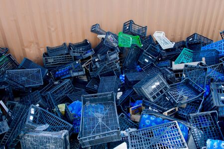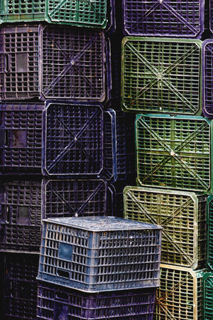 stacked old empty plastic crates for agricultural uses