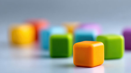 The image showcases colorful cubes, including teal, orange, and red, stacked on a textured black surface. The background is slightly blurred, creating a vivid, engaging atmosphere.