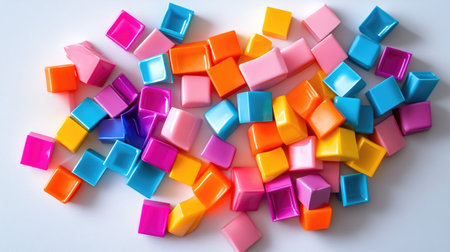 A vibrant display of colorful rectangular candy pieces creates a playful scene. The soft lighting and blurred background enhance the joyful aesthetic, perfect for creative uses.