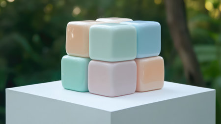 A set of glossy cubes in soft pastel colors stylishly arranged on a white pedestal, creating a contemporary aesthetic surrounded by lush greenery and natural light.