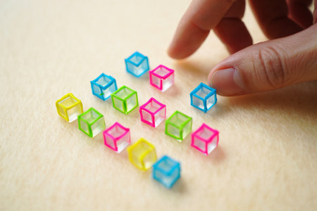 Hand arranges transparent cubes. Concept of creative arrangement and organization.