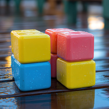 Brightly colored blocks rest on a shiny wooden surface after a gentle rain