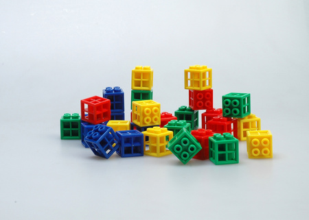 A collection of colorful plastic blocks scattered on a soft surface captures the essence of childhood play and creativity. Bright hues inspire imagination and learning.