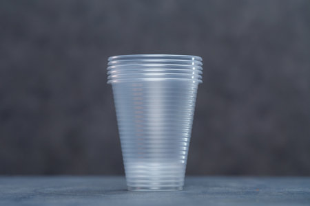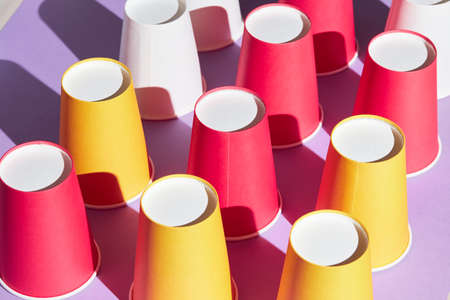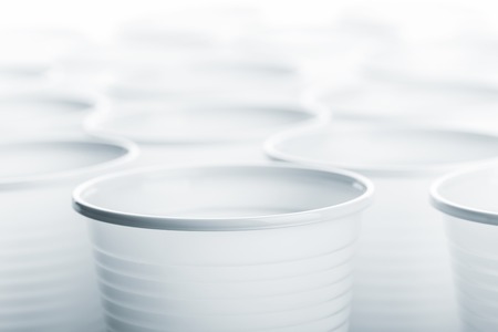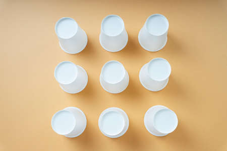 Disposable plastic cups on a white background. Minimalistic ecologically clean still life. Green technology and ecology problem concept.