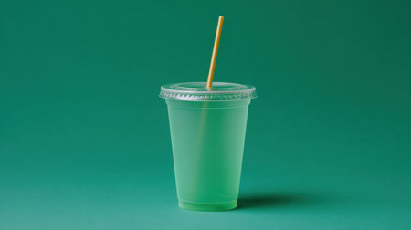 This image features a refreshing green drink in a transparent cup with a yellow straw, set against a solid green background, evoking summer vibes.