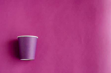 Eco-friendly disposable tableware for street drinks. Single lilac paper cup for coffee on a purple background.