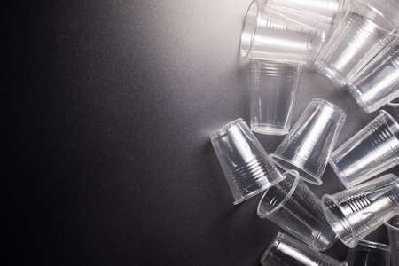 Group of single use plastic cups scattered on black background, concept for recycle and environment