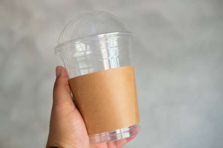 Man holding plastic cup disposable glass with brown paper sleeve for your design logo