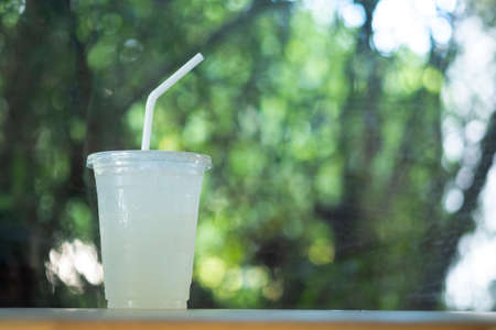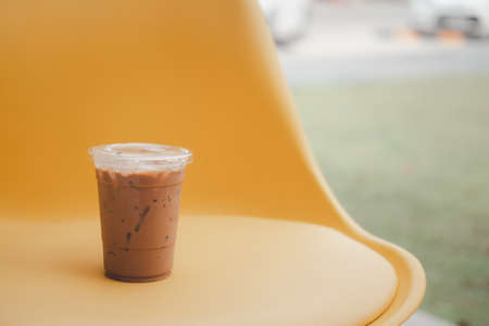 Iced mocha in plastic cup on yellow table at garden cafe restaurant in hot sunny day