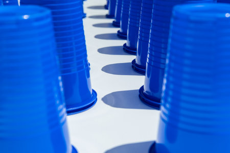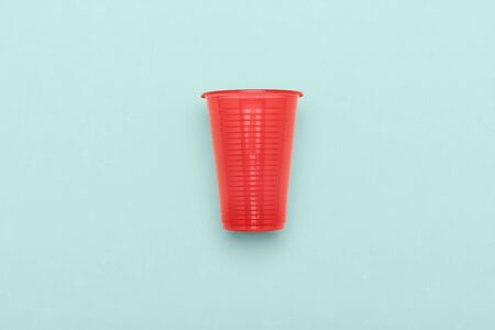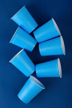 Plastic cups on a blue background. Nature's contamination with plastic.