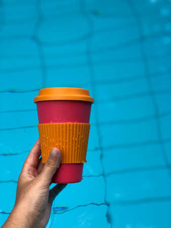 Woman enjoying coffee in a reusable bamboo mug at the swimming pool