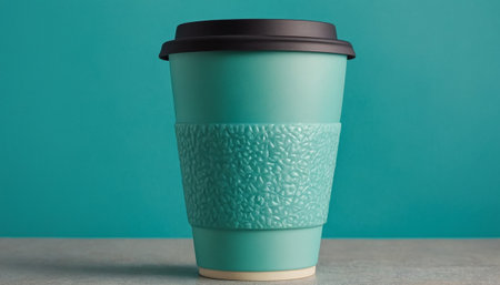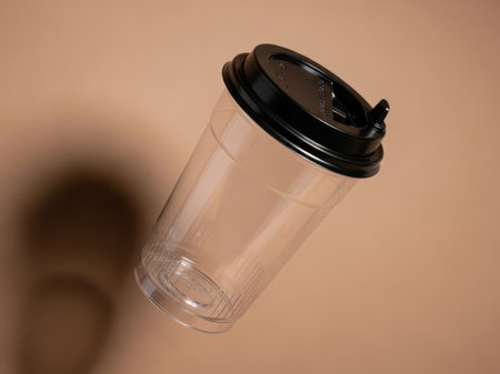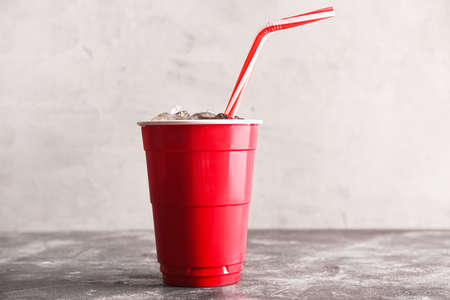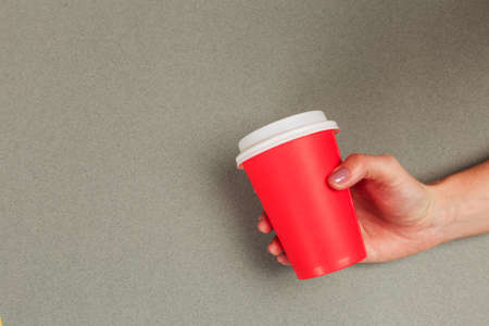 Red paper cups with plastic lids on bright paper backdrops copy space.