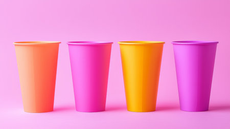 Brightly colored plastic cups in pink, orange, and yellow stand against a vibrant backdrop. Perfect for parties, events, or creative food presentations and decorations.