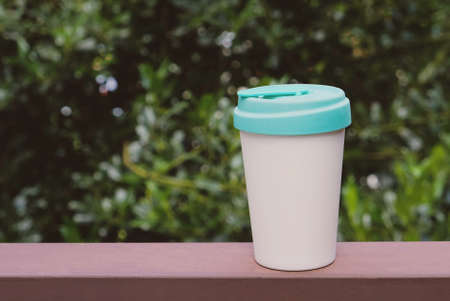 Reusable eco-friendly bamboo cup with lid, copy space.