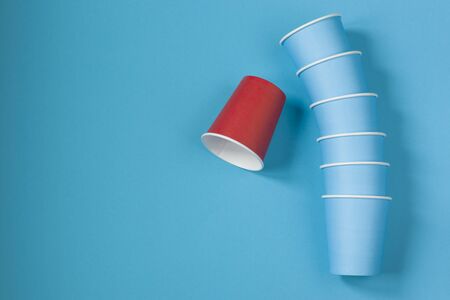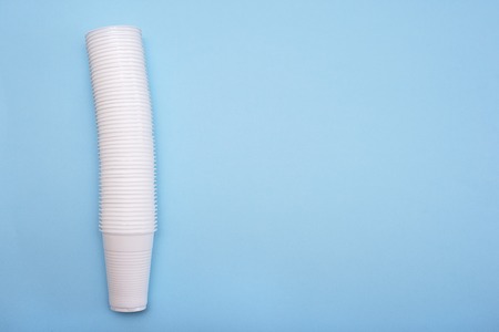 a stack of white paper cups on a blue background. Plastic rejection concept, zero waste