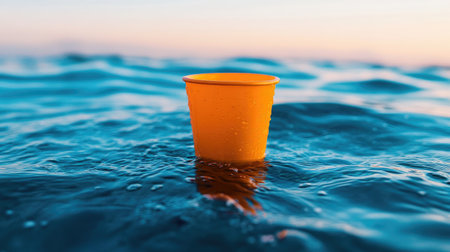 A vibrant yellow plastic cup floats serenely on calm blue waters, creating a striking contrast under a soft sunset sky. Ideal for summer-themed visuals.