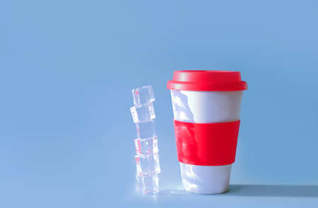 Burgundy paper cup for hot drinks stands on a blue background. space for text