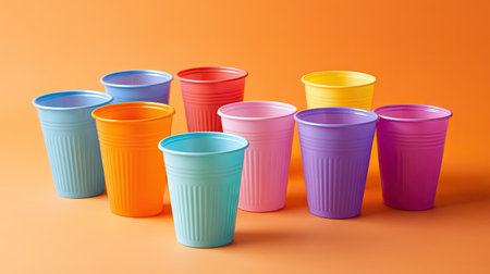 A vibrant display of colorful paper cups arranged on a soft pastel background. This cheerful scene captures the essence of fun, ideal for party themes and event decorations.