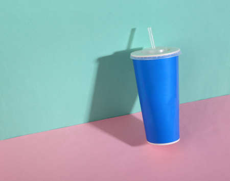 Cardboard cup with straw on blue-pink background. minimalism. trendy shadow. creative layout.