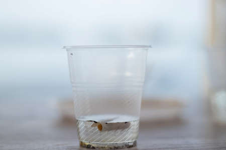 Close up of iced coffee plastic cup with a little coffee left on the bottom on wood table in the morning