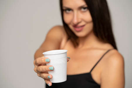 female manicure. Beautiful young woman's hands holding coffee on grey background