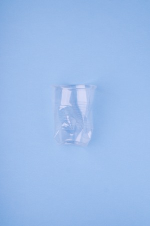 Crashed plastic cup on blue background. Plastic utilisation concept. Ecological problem, global environment.