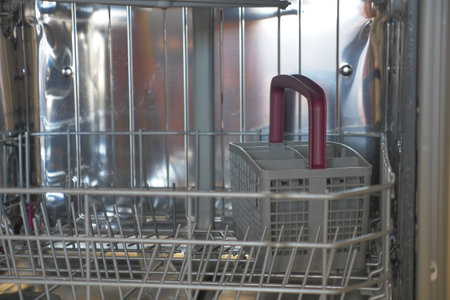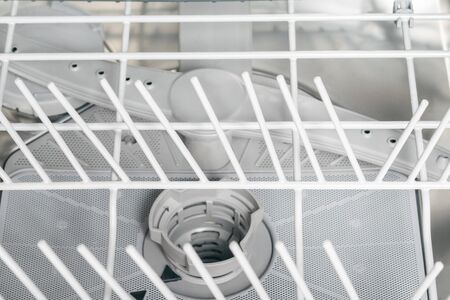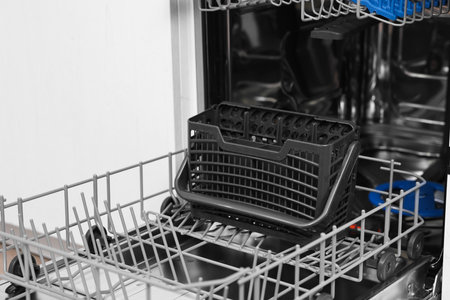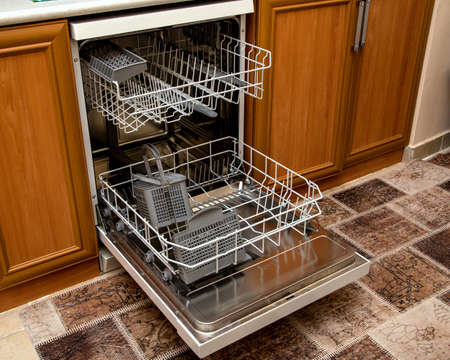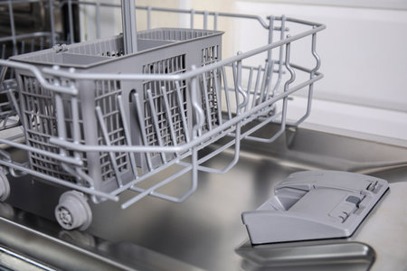 Close-up view of an open empty automatic dishwasher in kitchen. Modern kitchen appliance. Housekeeping equipment, Household chores.