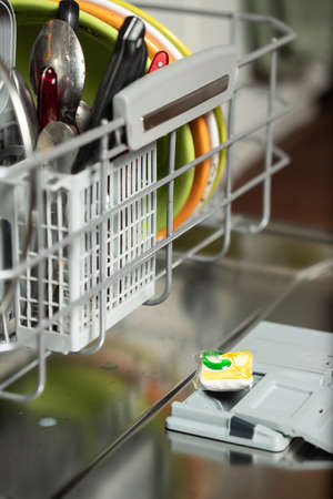 Close-up of young women hand holding a colored capsule for the dishwasher. In the background, out of focus, is a dishwasher with clean dishes. Small depth of field.