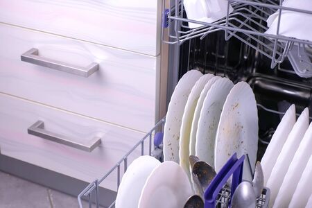 Modern kitchen interior with white dishes ready to be washed in electronic dishwasher appliance