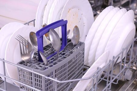 Dishwasher basket with dirty white dishes and cutlery in the kitchen. Close-up view.