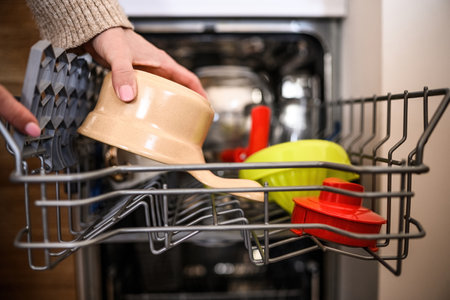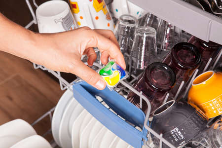 Close-up of a woman's hand filling a dishwasher machine