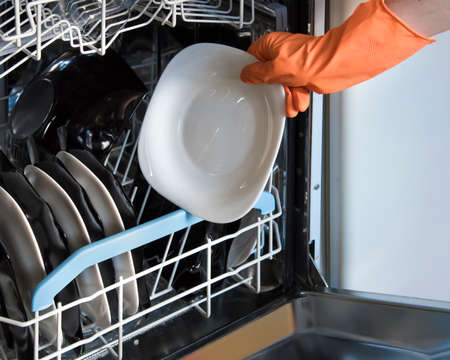 Housewife in rubber gloves getting clean dishes out of dishwasher closeup