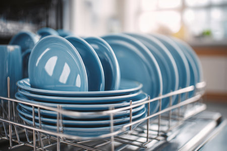 Open dishwasher with clean dishes, focus on modern kitchen appliance, blue-toned light.
