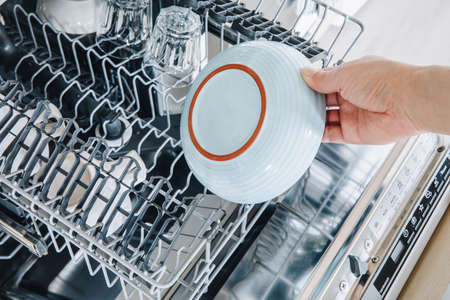Girl hand with clean dishes inside of dishwasher