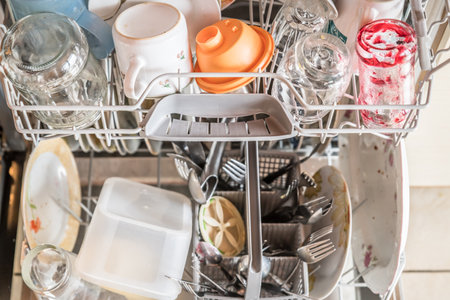 A dishwasher with a full load of dishes and silverware, AI