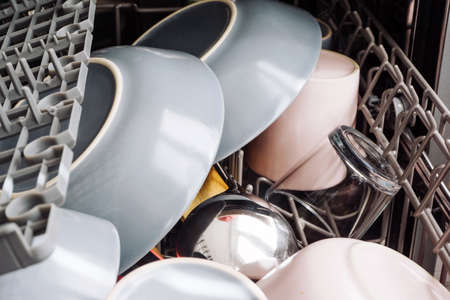 Close-up of plates in the dishwasher. Household chores and washing dishes.