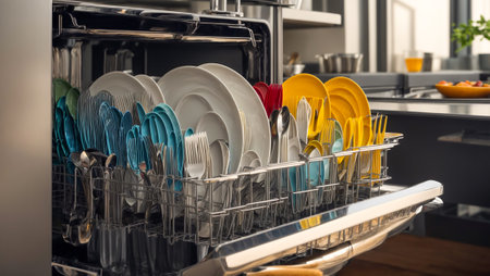 A modern dishwasher filled with neatly arranged clean dishes and silverware shines under bright lights in a stylish kitchen. Ideal for images showcasing convenience and home efficiency.