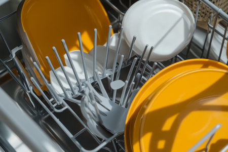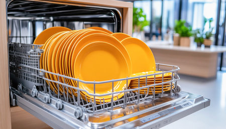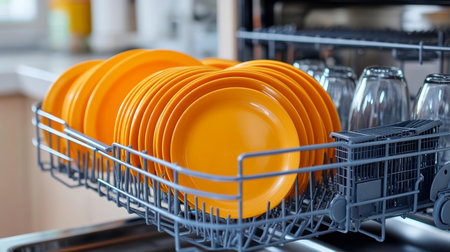Clean Dishes, Sparkling Kitchen Modern Dishwasher with Bright Orange Plates Ready for Hygienic Wash