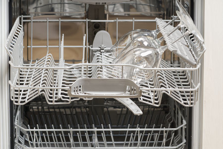 Open clean empty dishwasher in kitchen, closeup