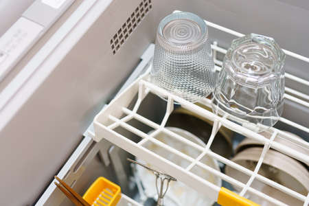 Open dishwasher with clean glass and dishes selective focus Clean glasses after washing in the dishwasher.