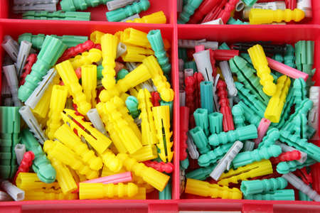 Plastic multi-colored dowels, various sizes, a selection of dowels for various wall materials, concrete, wood, close-up
