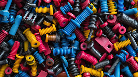 An engaging close-up of a vibrant collection of screws, bolts, and fasteners in various colors ideal for industrial, craft, or DIY projects.