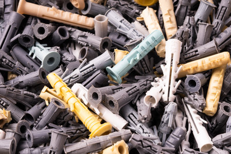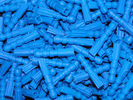 A handful of nylon dowels for self-tapping screws and wood screws. Construction abstraction. Industrial background.