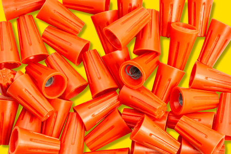 Colorful twist on wire connectors are piled together, showcasing their design for safe electrical connections. The vibrant orange stands out.