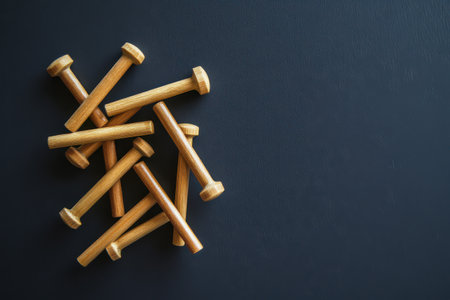 A collection of wooden dowels is scattered across a black surface showcasing their smooth texture and varying lengths in a simple arrangement.