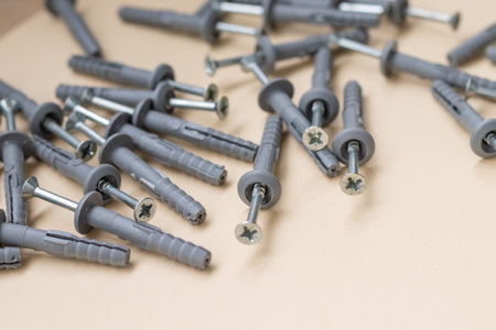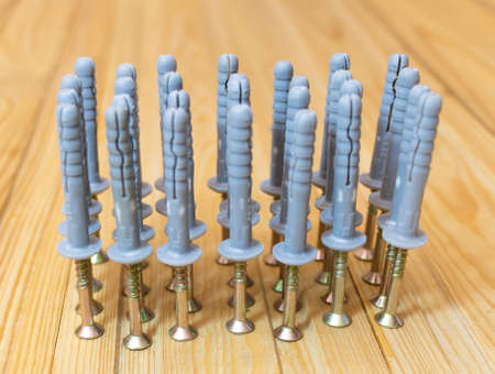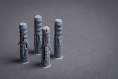 Plastic dowels and screws on grey surface