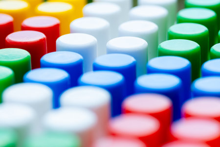 A vibrant collection of plastic screws in yellow, red, and blue shades is artfully spread across a flat surface, creating a striking visual composition.