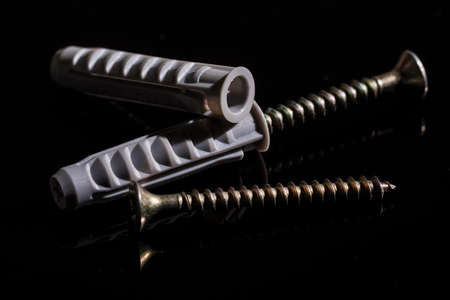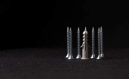 Dowels with self-tapping screw on black background with copy space.